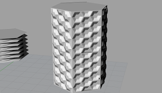 This design serves an aesthetic function, because of the jewel-like texture of the surface. It could also be used as a vase (and could look great as a glass object). The qualities that make it so pleasing to the eye are the sharp, repetitive angles and the overall pattern they form. Both versions of the object would be self-supporting and fairly solid due to their simple base structures. There could be an issue printing these objects (more specifically the shorter object) because there is the possibility of the angles being too sharp and close to horizontal.